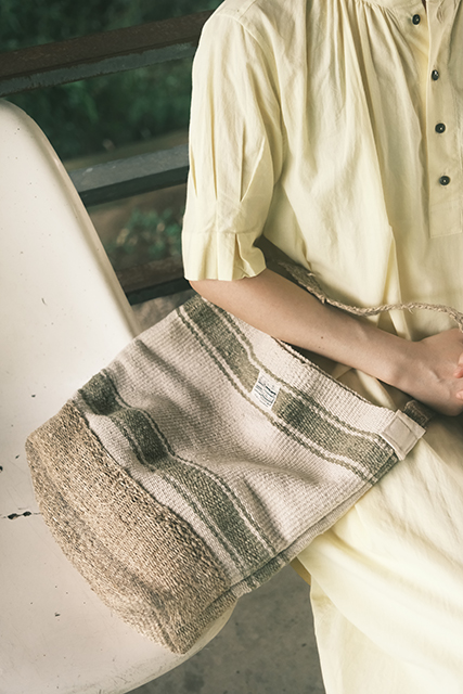 從纖維的捻製成線,經過地織機的織做,到車縫後而誕生。在背帶和底部選擇耐磨,但接觸皮膚不刺癢的大麻纖維。包體選用植物染綠色麻線,搭配白色棉線,為穿搭增添一分鮮活感。